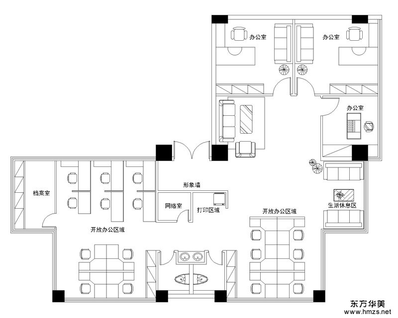▄設計需求: 甲方對辦公空間的功能需求包括前臺接待區、公共辦公區、會議室、董事長辦公室、走廊、茶水間、財務室等,此外甲方希望可以將現有家具要合理利用上。設計師根據客戶要求,完成了平面布置圖。